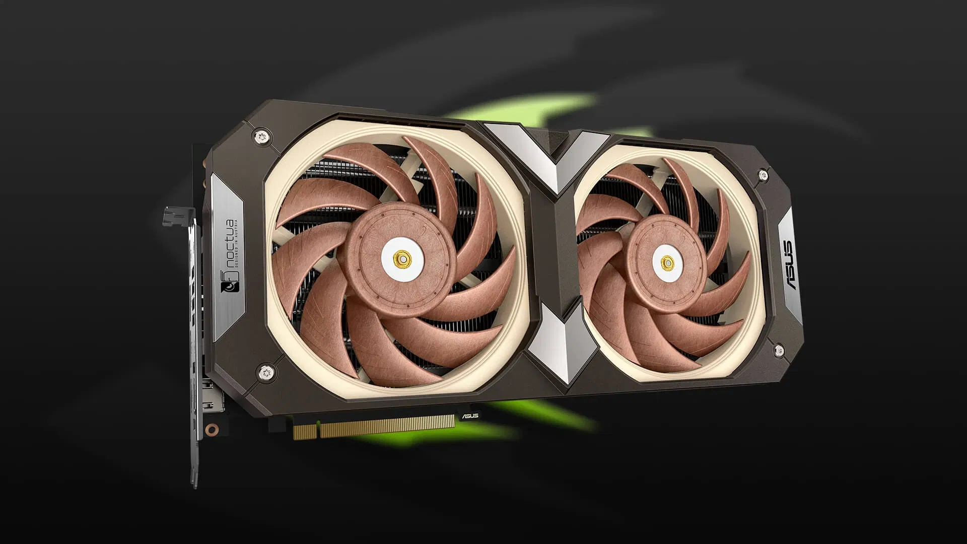 ASUS knows that Noctua enthusiasts care as much about the aesthetics of their builds as they do about high performance and low noise levels. Accordingly, ASUS created a custom brown shroud for the Noctua fans, complementing their distinctive color scheme and providing a secure mounting system — no zip ties needed. ASUS and Noctua logos on the front and sides of the shroud, along with subtle graphics on the full-length alloy backplate, help this card coordinate perfectly with other Noctua components in a system.