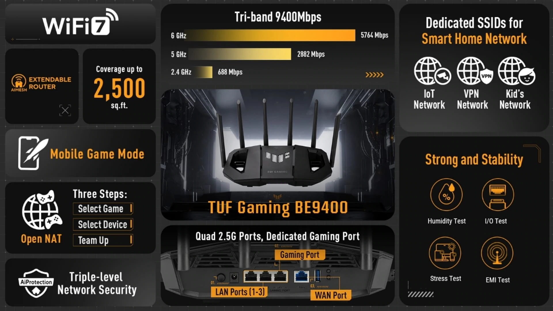 The TUF Gaming BE9400 is built on WiFi 7 technology, which offers faster data transmission and reduced latency compared to earlier generations. With tri-band throughput of up to 9400Mbps, it uses ultrawide 320MHz channels and 4096-QAM modulation to achieve higher capacity and efficiency. Multi-Link Operation (MLO) allows devices to connect across the 2.4GHz, 5GHz, and 6GHz bands simultaneously or switch between them seamlessly. This helps maintain stable speeds, even when multiple devices are competing for bandwidth.