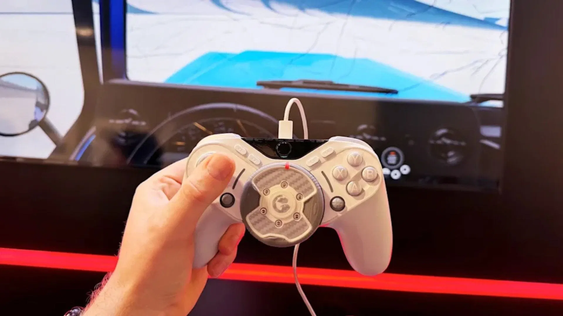 The controller was demonstrated on the show floor at CES, where attendees could test it using a simplified driving simulation. The demonstration involved piloting a large truck through a digital world of ramps and curved roads, designed to highlight how the steering wheel behaves during tight manoeuvres and sudden turns. Early impressions suggest that the force feedback is surprisingly strong for such a small wheel, providing resistance and motion similar to full-sized racing peripherals, yet contained within a controller frame that fits in the hand.