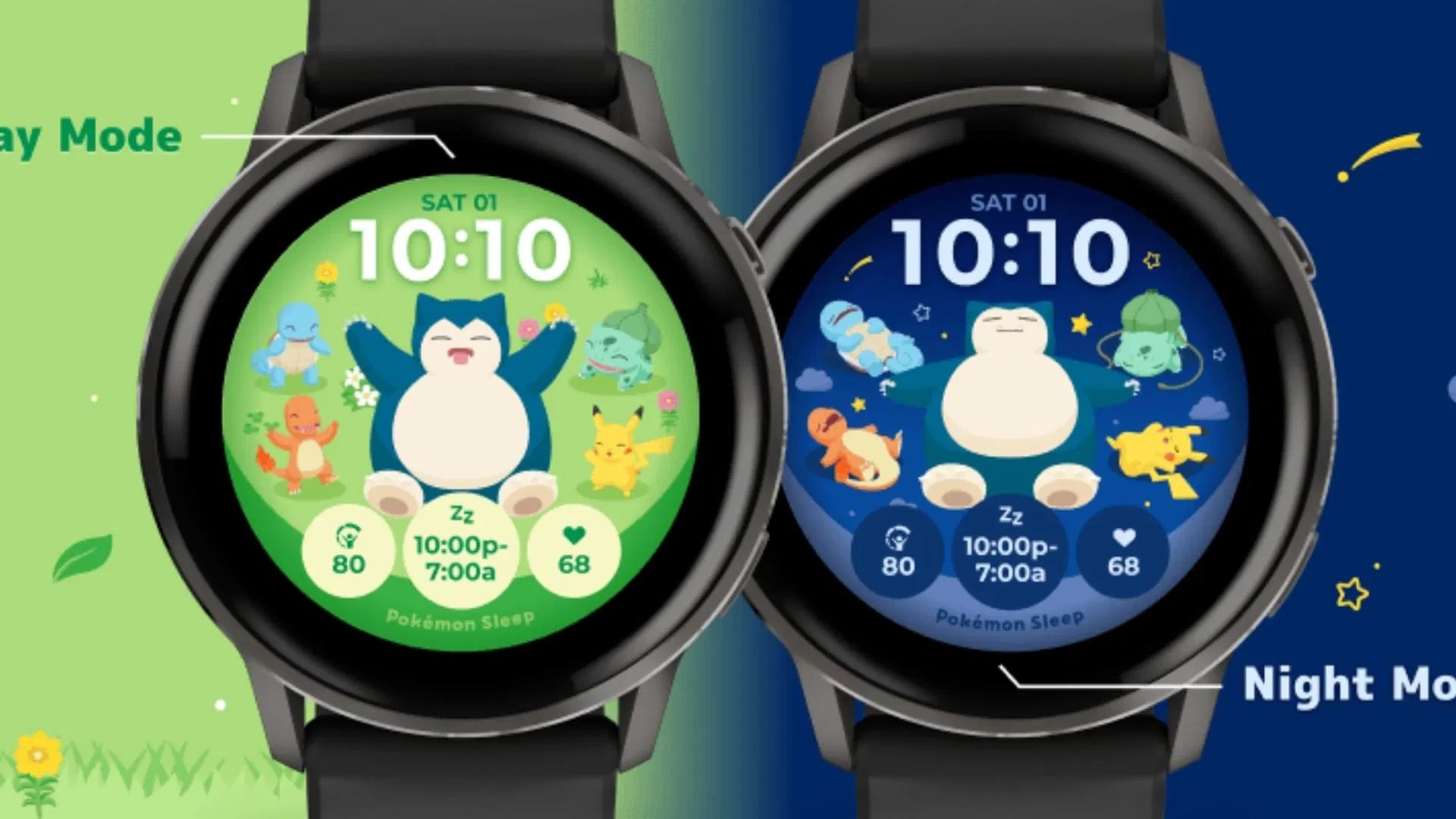 Two main options are available. The “Pokémon Sleep: Snorlax & Friends” watch face features a group of Pokémon including Bulbasaur, Charmander, Squirtle, Pikachu and Snorlax, set within Greengrass Isle. The second option, “Pokémon Sleep: I Choose You”, allows users to select a single Pokémon from a pool of 48 characters.